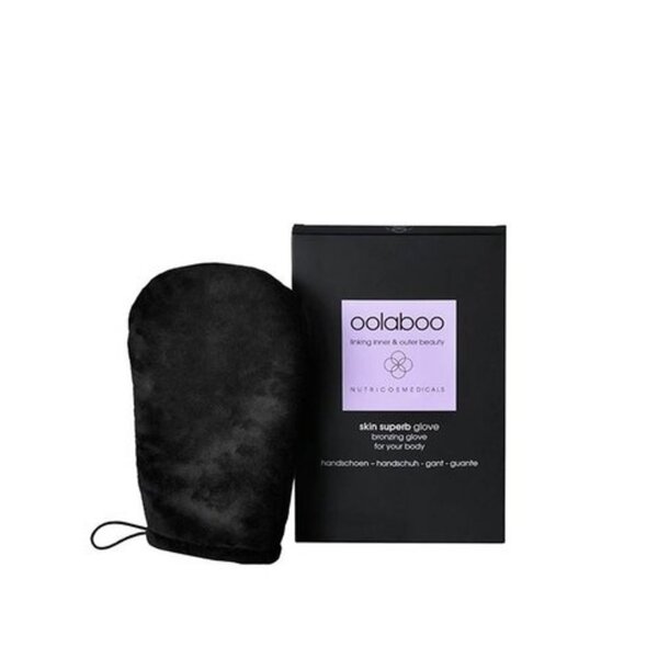 Ook kun je de huid insprayen met Oolaboo zelfbruiner spray en daarna met de glove nawrijve om een egaal effect te krijgen.