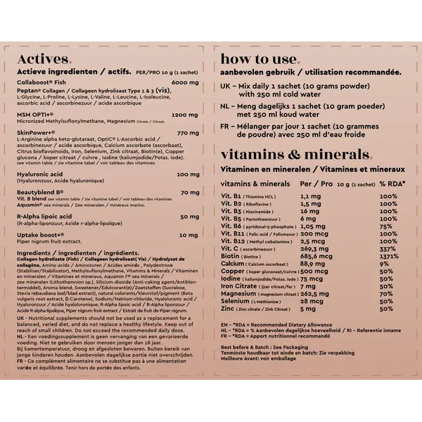 Tip: Gebruik de collageen booster 15 minuten voor het slapen gaan en start je dag fris en fruitig de volgende ochtend na een goede nachtrust. Het magnesium in de collageen booster helpt de hersenen en het lichaam te ontspannen. Door deze ontspannende werking kan magnesium helpen om beter en dieper te slapen